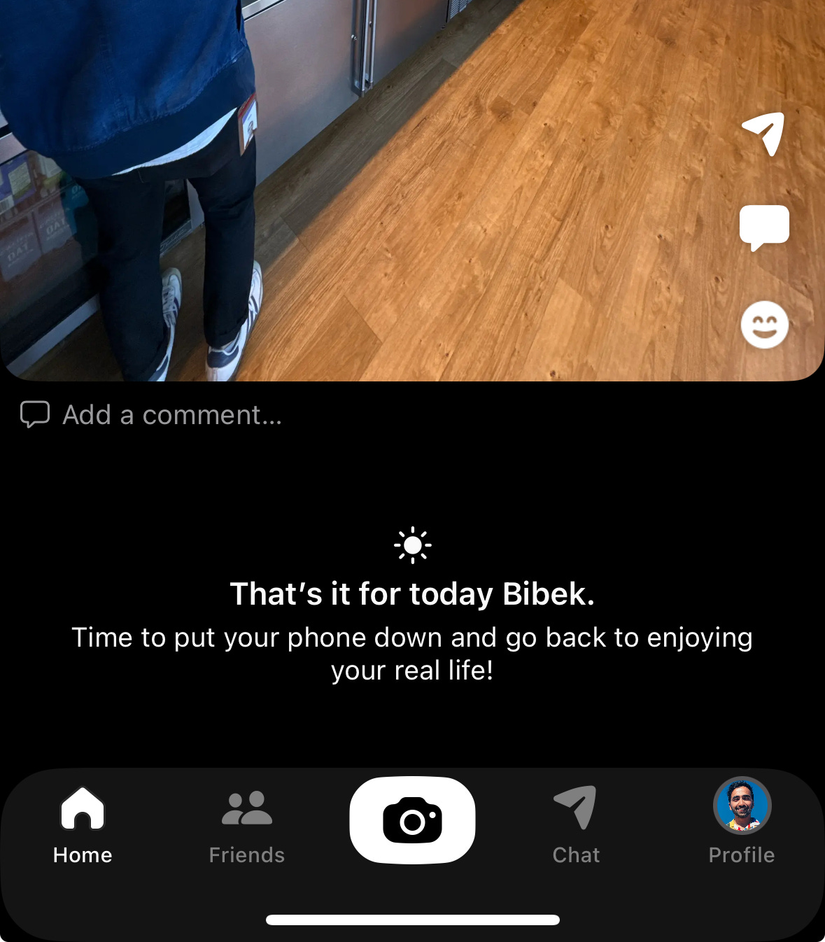 Realness. The need (or at least encouragement) to post right away at a random time disincentivizes (or makes impossible) excessive curation, editing, or filters. I’ve seen BeReals of friends doing everything from making food to brushing their teeth to sitting on the toilet. It’s very raw, a little silly, and incredibly humanizing. The flip side of this is that you probably don’t want to see content that real from all the people you have on the friends list on other apps like Instagram. In my view that’s the point though (which, sadly, I think a lot of people missed–or at least didn’t appreciate as much). The app’s core premise reminds you that you’re a human with limited social capacity.